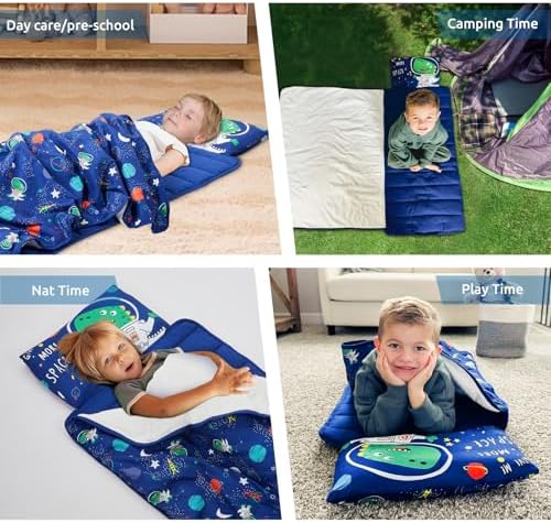 GENEROUSLY SIZED – Toddler nap mat measures 54.3”*33.5” , comes with 15.8″x10.3″ pillow. Attached blanket measures 42.5″ x 33.5″. Suitable for children ages 3 to 6. Featuring playful cartoon patterns and vibrant colors, it creates a cozy and warm environment that enhances children’s rest time. From whimsical dinosaurs to magical mermaid, these mats inspire creativity and make napping enjoyable and exciting.