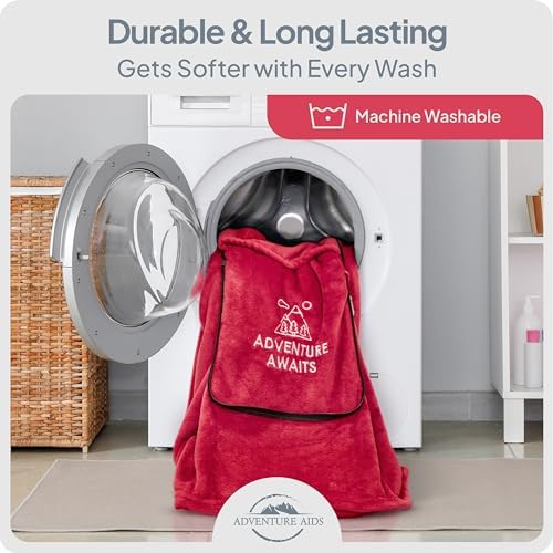 Say goodbye to cold and uncomfortable travel and hello to the ultimate in cozy comfort and convenience. Whether embarking on a long-haul flight, cross country car trip or camping, this travel blanket has you covered. Two luxurious velvet soft blankets feature pockets for your feet and hands for an extra touch of coziness. Need a pillow instead? Simply zip them into fluffy, plush pillows for a comfortable nap. Here’s why this set of travel blankets from Adventure Aids are the essential travel accessory and will make every journey a cozy one… Two soft blankets Pocket for feet Pouch for hands Blankets zip into pillows Backpack clip Luggage sleeve Compact Machine washable Packaged to arrive in perfect condition MATERIALS: 100% Polyester DIMENSIONS: Length: 61” x Width: 43” COLOR: Teal / Red