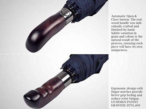 Vented double canopy –specially engineered to help resisting windy conditions. Superior ultra-soft & ultra-lightweight 300T high-density water repellent fabric keeps you dry and protected from the rain. It is the finest fabric ever used in any umbrella and dries very quickly. Opens and closes easily at the press of a button. Press the same button to correct the ribs if the umbrella ever inverts. Luxury handcrafted real wood handle with finger-notches for ultimate holding comfort.